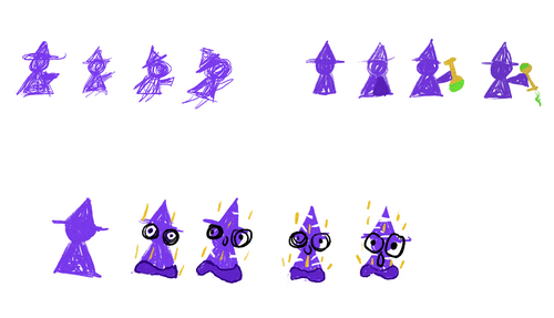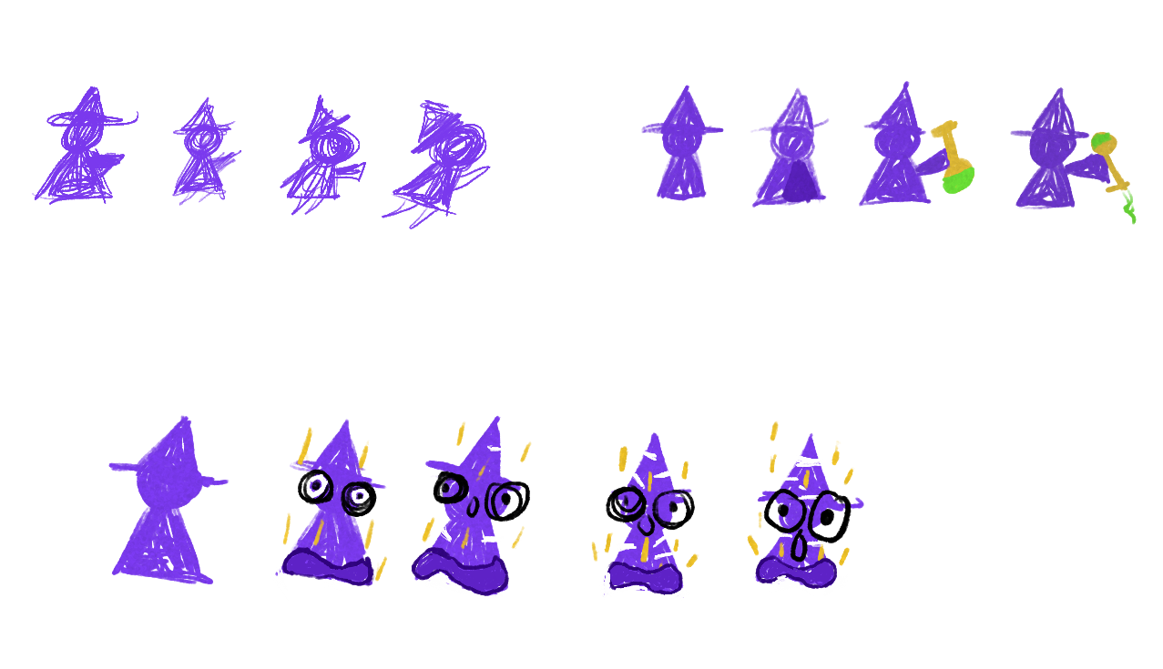 For my animations the top left is the little mage getting pulled away by the broom as she grabs it, the top right is her pouring a potion into the giant cauldron and the bottom animation is her teleporting between each floor of the bookshelf. I’m very excited about my room but what excites me the most are the floor tiles and the teleporting doors. I want the floor tiles to unlock a secret. But while I am most excited about those aspects I feel like the teleporting from floor to floor might be extremely difficult to do because hotspots in AGS can be a little fickle so I’m just concerned about the room not being interact-able because of my coding and hotspot inaccuracies. And lastly I feel like I should be careful with designing my background and remember that there needs to be sprites made for certain objects because I sometimes include objects into the background when it shouldn’t be part of it.